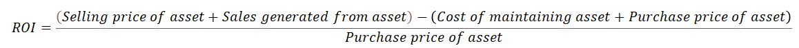 To calculate ROI for a normal asset investment where the asset is disposed of after its useful life could look something like this: